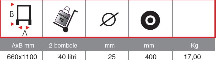 Bibo 40 Plus este un carucior profesional din otel. Manerele sunt cu protectii de siguranta. Cadru din teava sudata Ø mm 25.Suport lateral si platforma personalizata pentru doua tuburi de 40 litri. Este dotat cu lant de siguranta, caseta scule si suport. Dotat cu doua roti pneumatice pentru santier cu diametru 400mm si butuc din plastic.