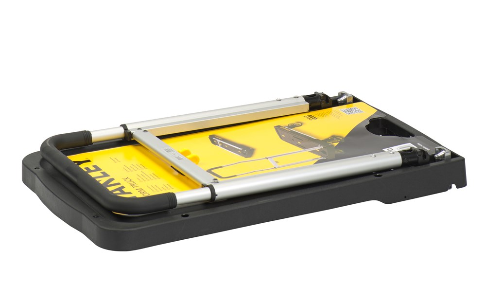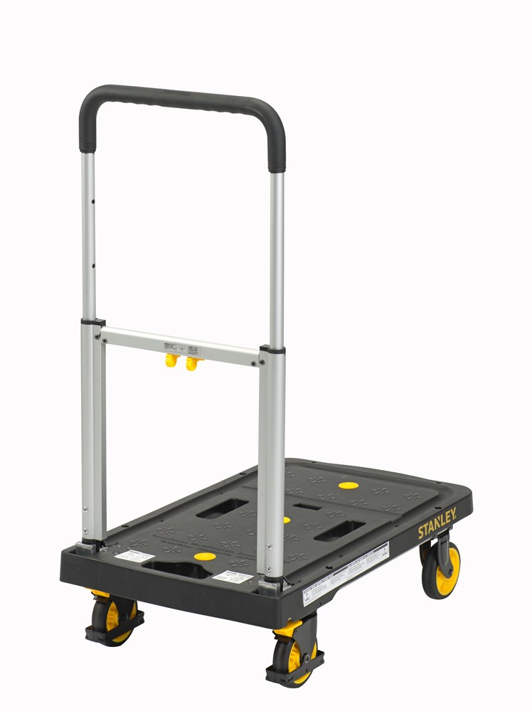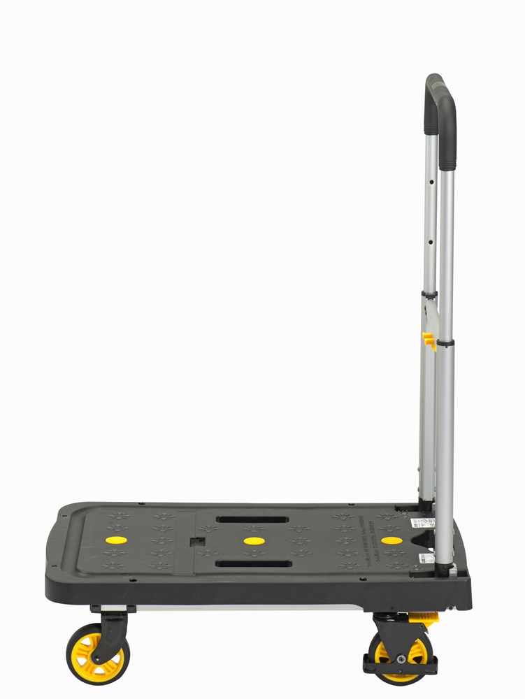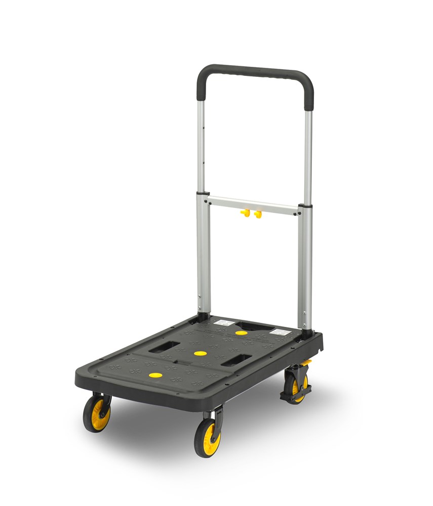 Cărucior cu platformă din plastic. Toate cele 4 roți se pliază pentru a oferi un produs ultra-compact care poate fi depozitat oriunde.