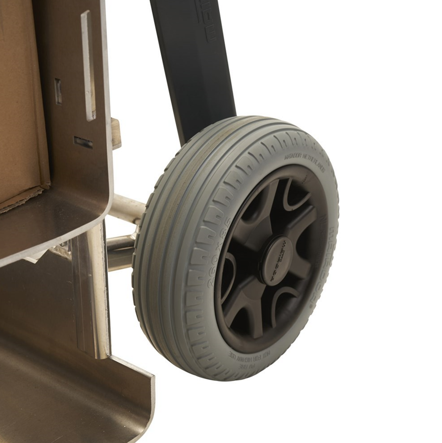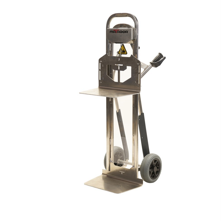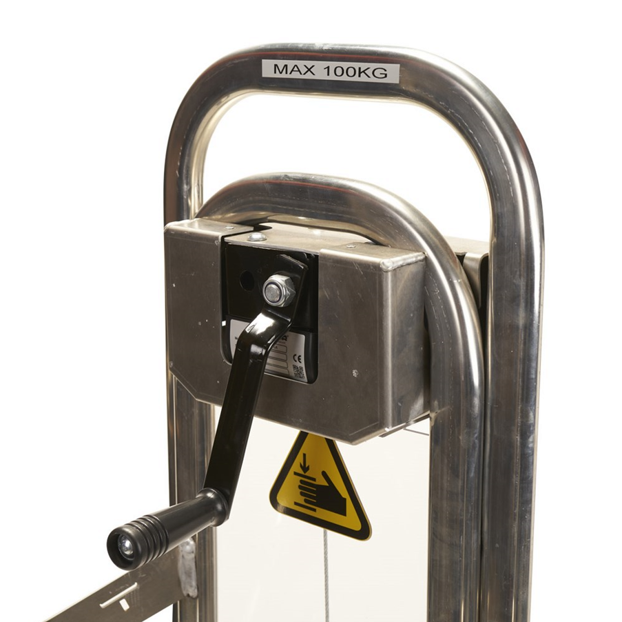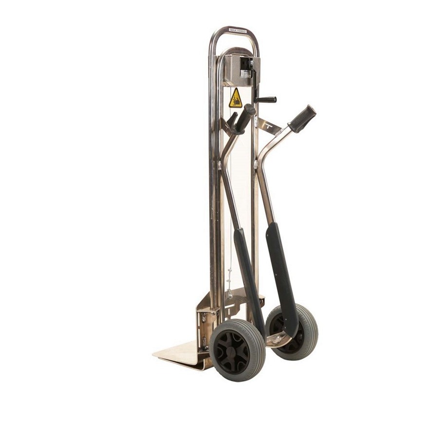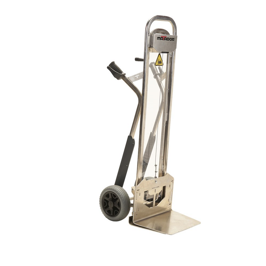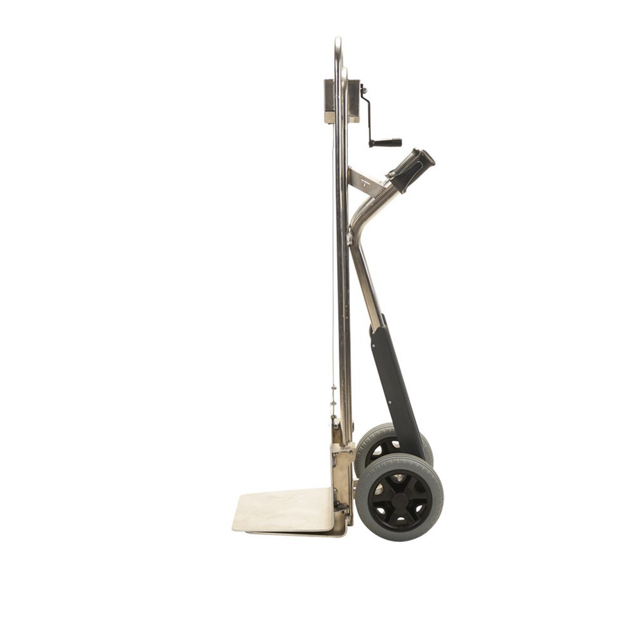 Căruciorul ușor din aluminiu echipat cu mânere ergonomice din cauciuc cu articulații de siguranță si sistem de ridicare a platformei superioare prin troliu.