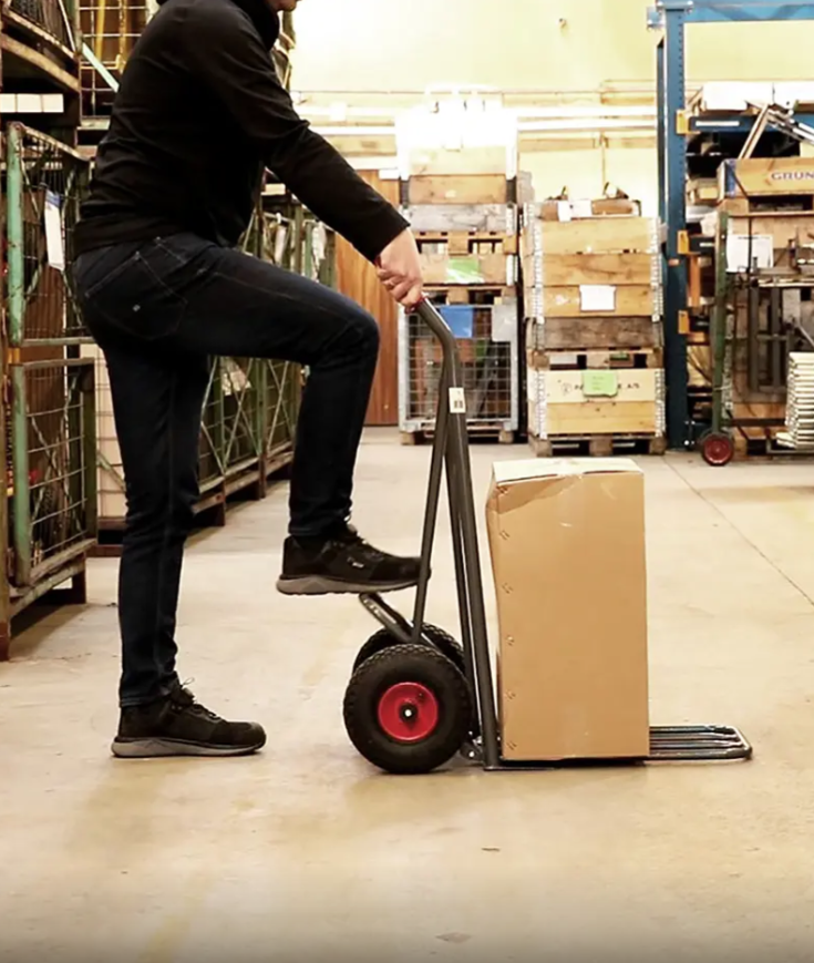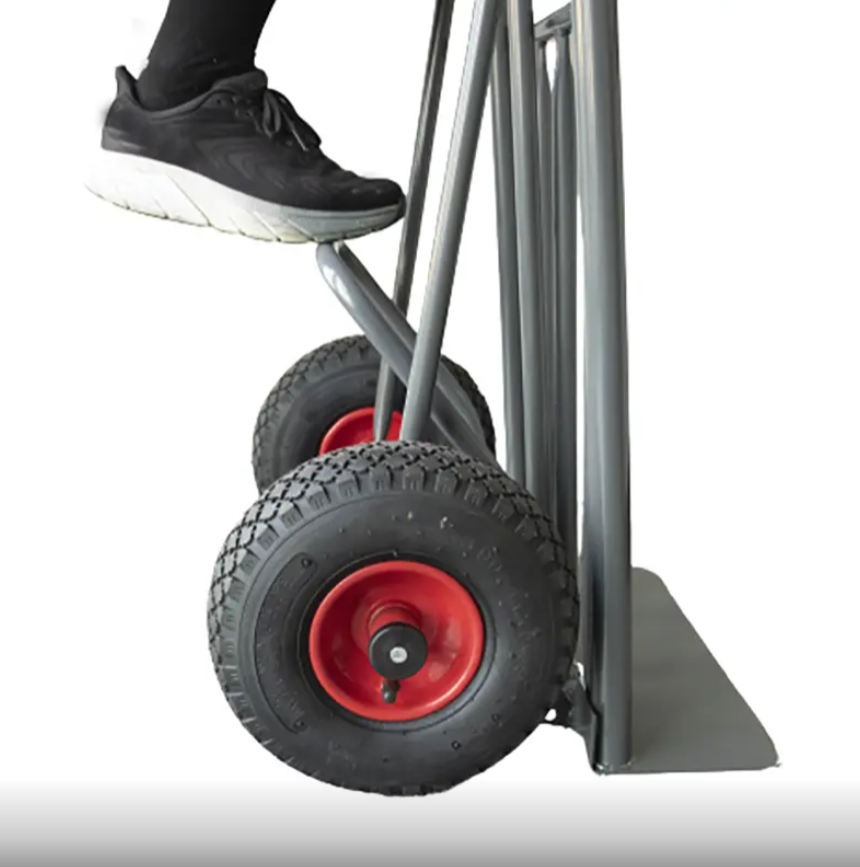 Cărucior profesional port-pachete, cu capacitate ridicată, dotat cu pedală brevetată pentru ridicarea ușoară a sarcinii.