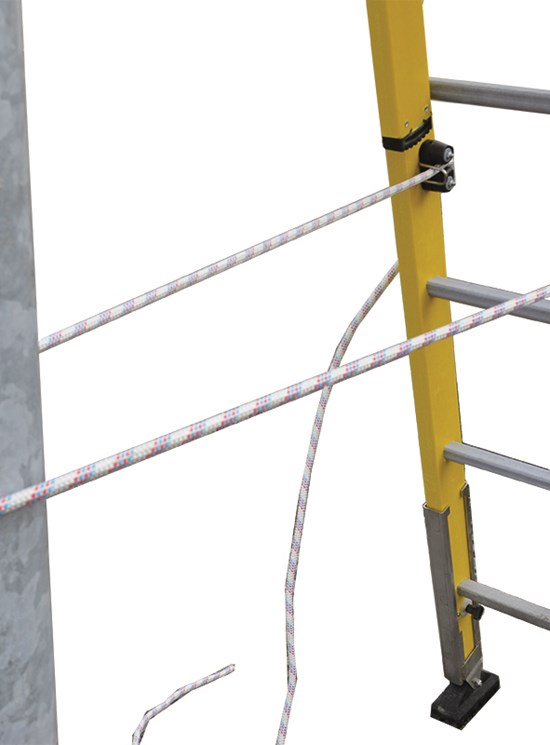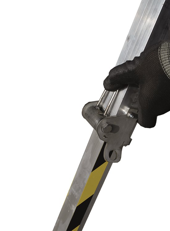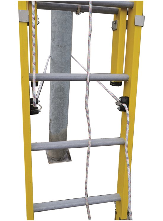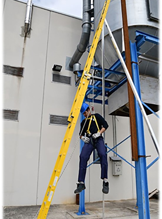 Pe scară este montat un dispozitiv de franare pe franghie in caz de cadere. Dispozitivul este ancorat de prima treaptă din partea superioară a scării, care este roșie, întărită și testată.