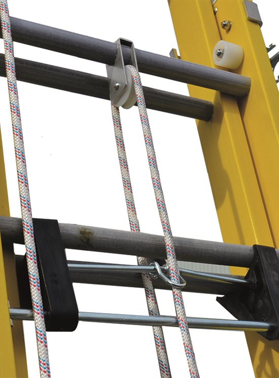 Pe scară este montat un dispozitiv de franare pe franghie in caz de cadere. Dispozitivul este ancorat de prima treaptă din partea superioară a scării, care este roșie, întărită și testată.