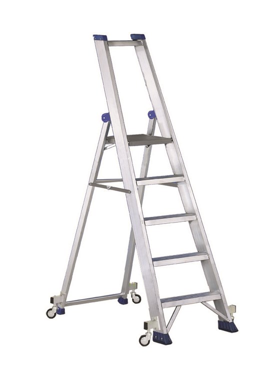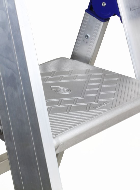 De îndat? ce operatorul urc? prima treapt?, arcurile ro?ii sunt comprimate permi?ând pl?cu?elor de baz? ale sc?rii s? se sprijine pe sol, împiedicând scara s? se deplaseze. Imediat ce operatorul coboar?, ro?ile împing scara în sus ?i pl?cu?ele nu mai ating podeaua.