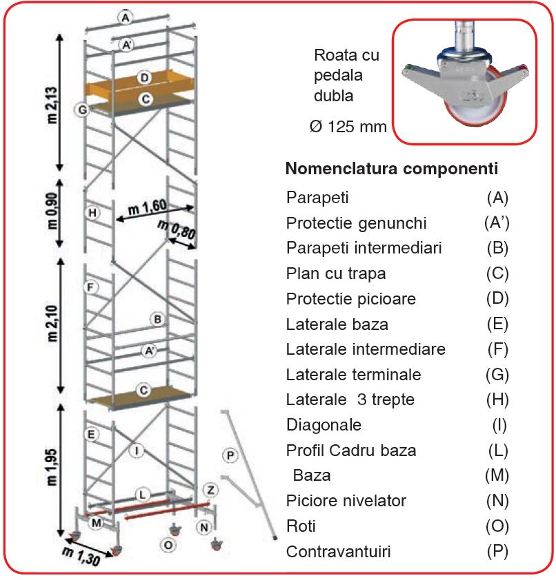 Schele profesionale formate dintr-un modul de baza de 1.95m, module intermediare 0.60/0.90/1.50/2.10m si un modul terminal de 1.83m ce contine balustrada de siguranta.