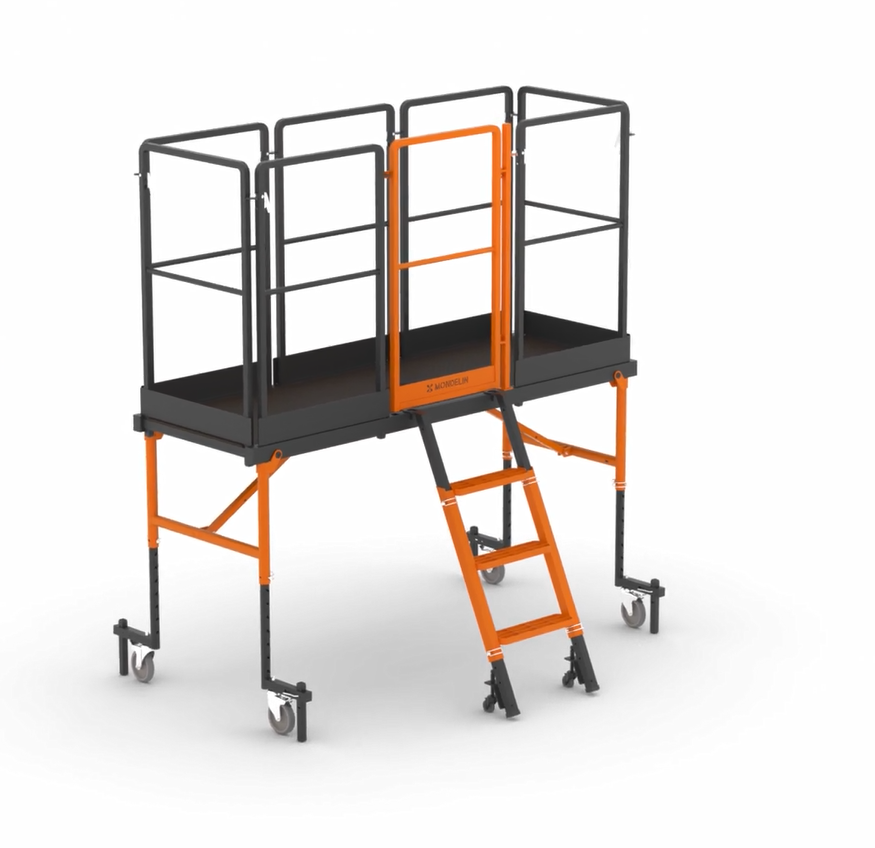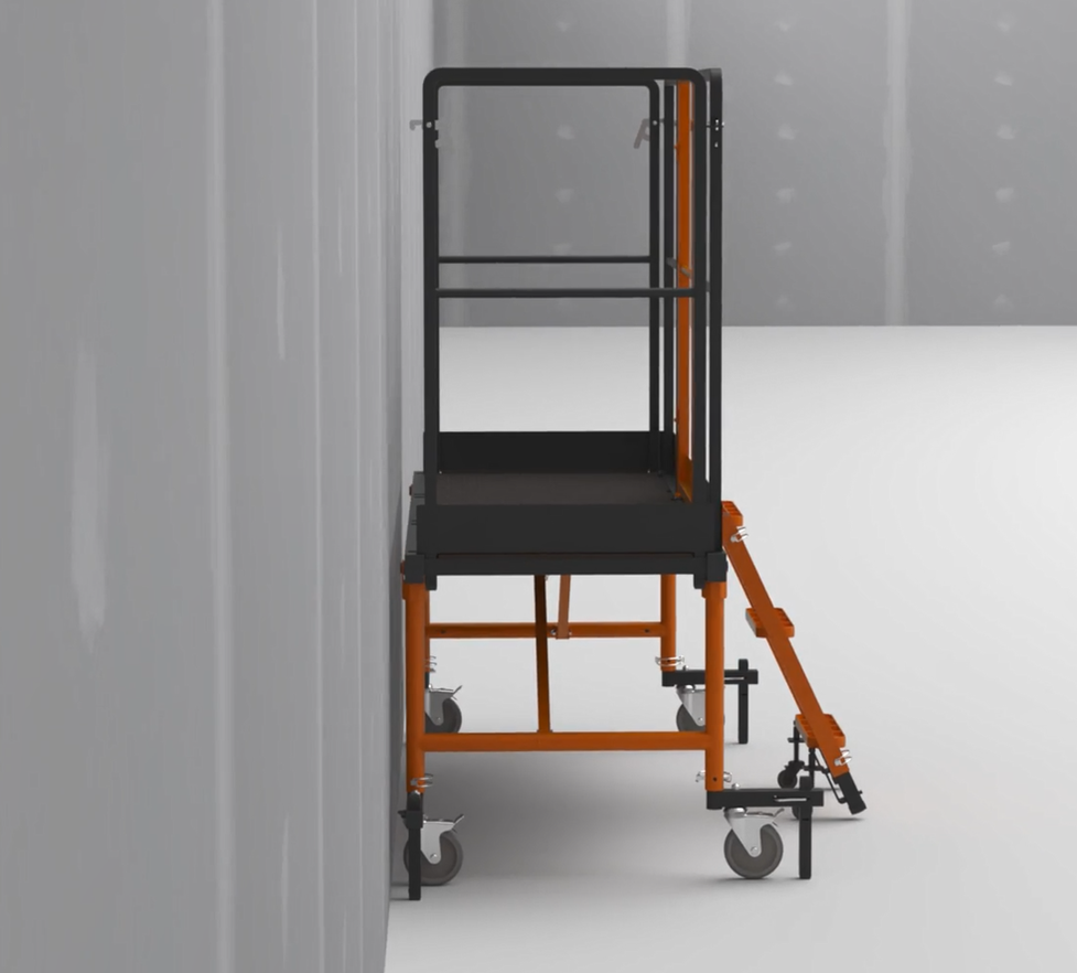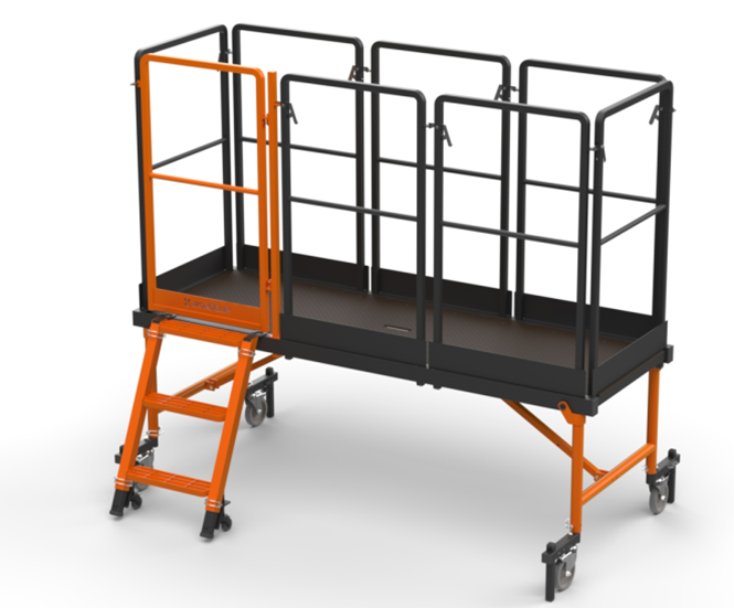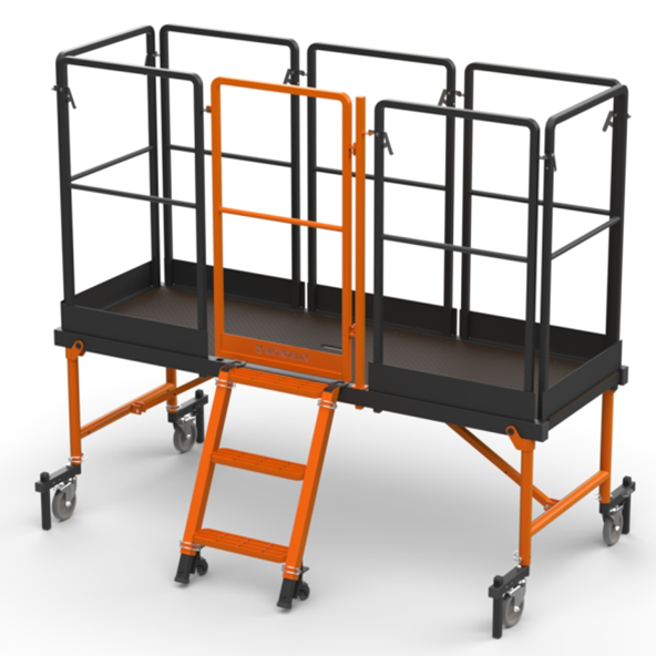 - Platforma este echipata cu 4 roti pivotante rezistente la perforare echipate cu frane si stabilizatori ultra-rapidi de asamblat.