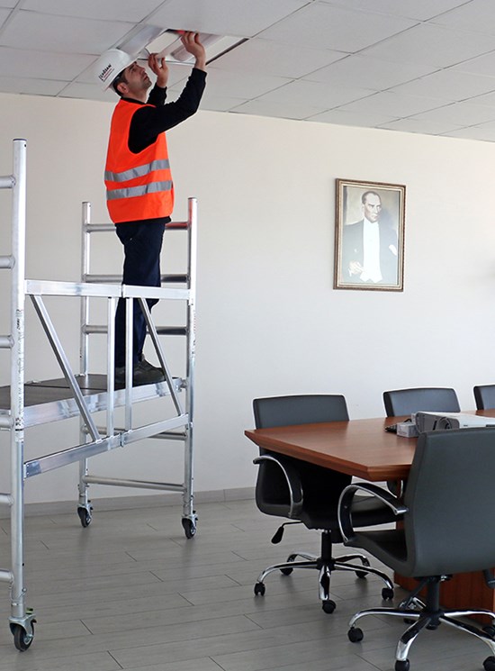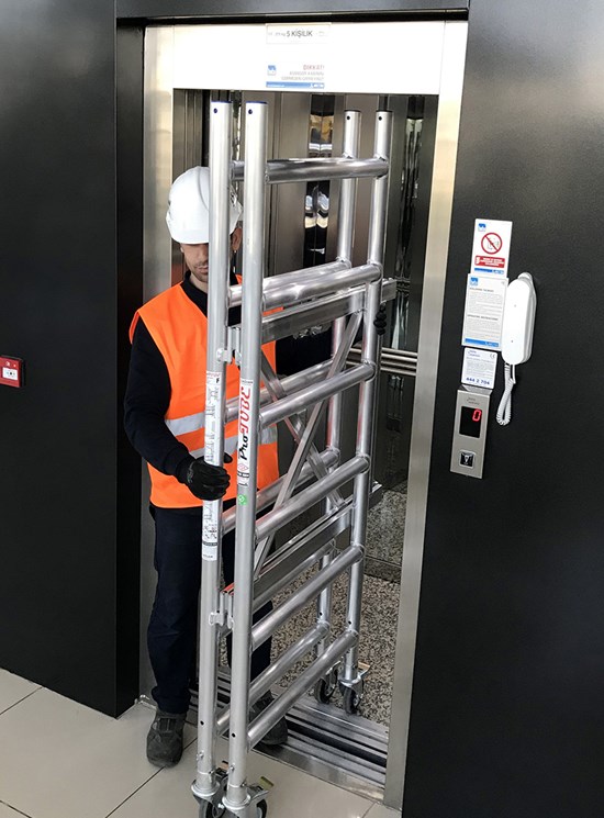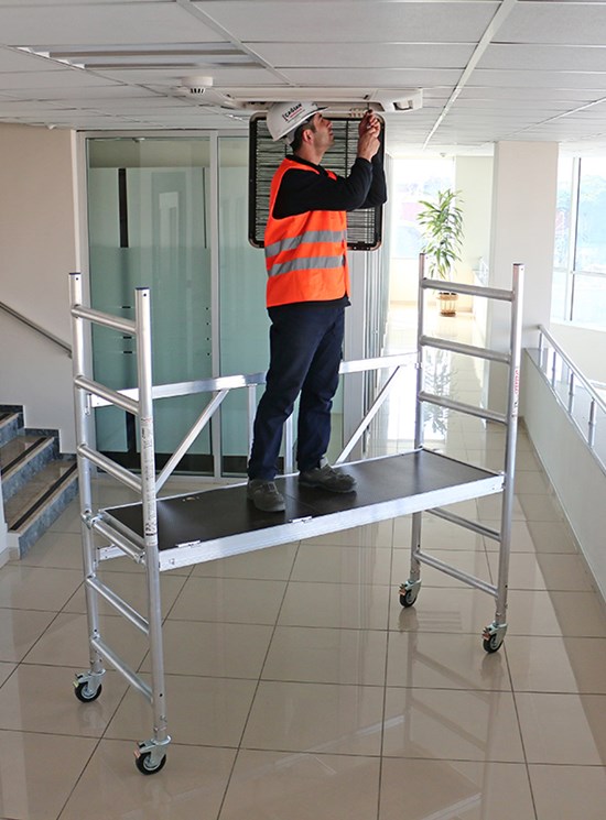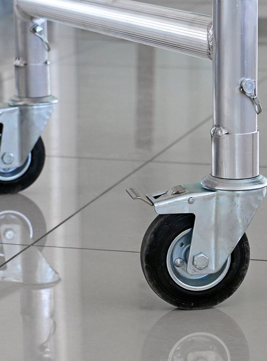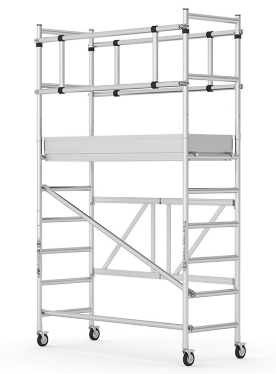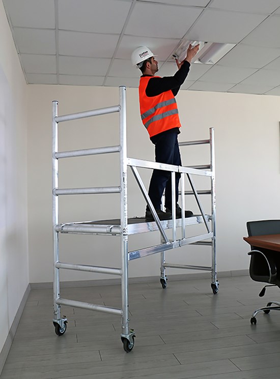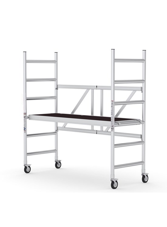 Modulul A: 1 baza pliabila, 2 laterale (6 trepte), 4 roti cu frana diametru 125mm si 1 plan de lucru. Inaltime modul 1.95m