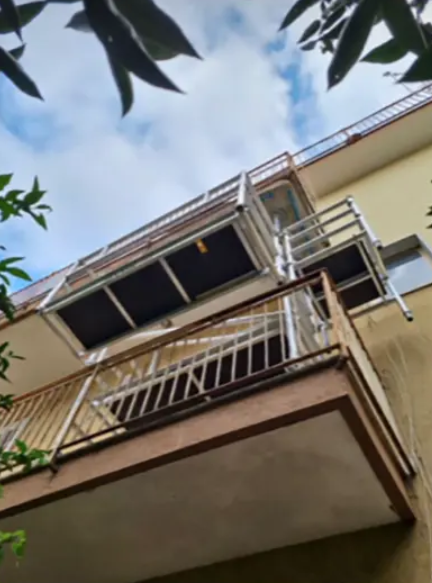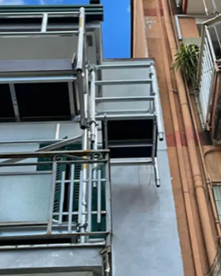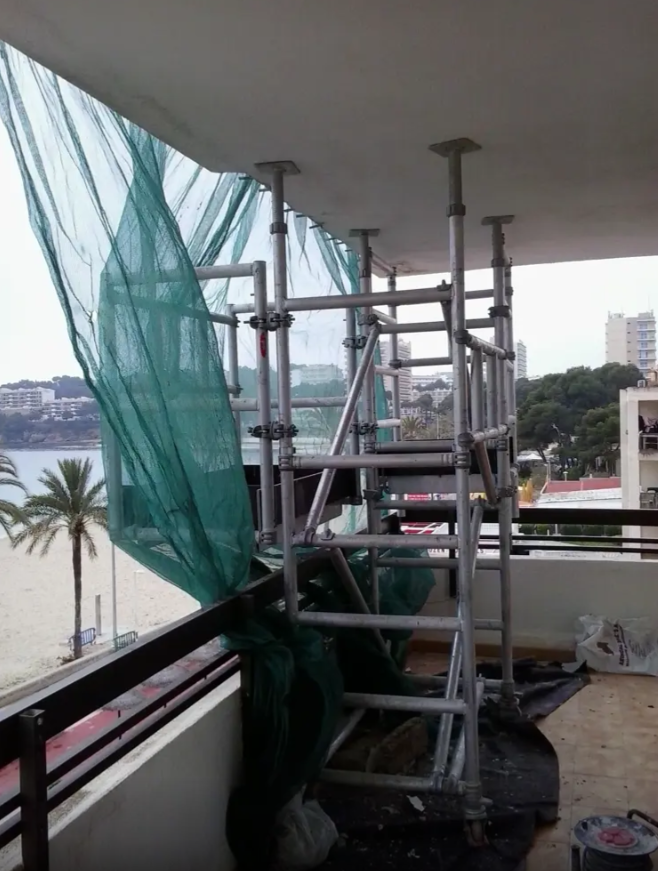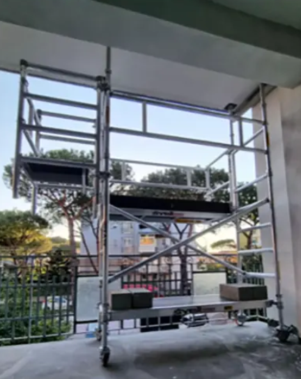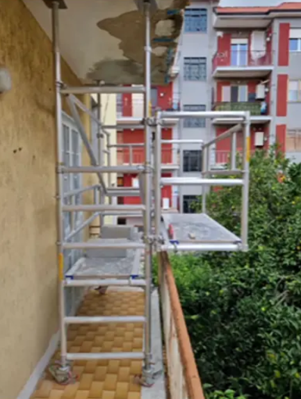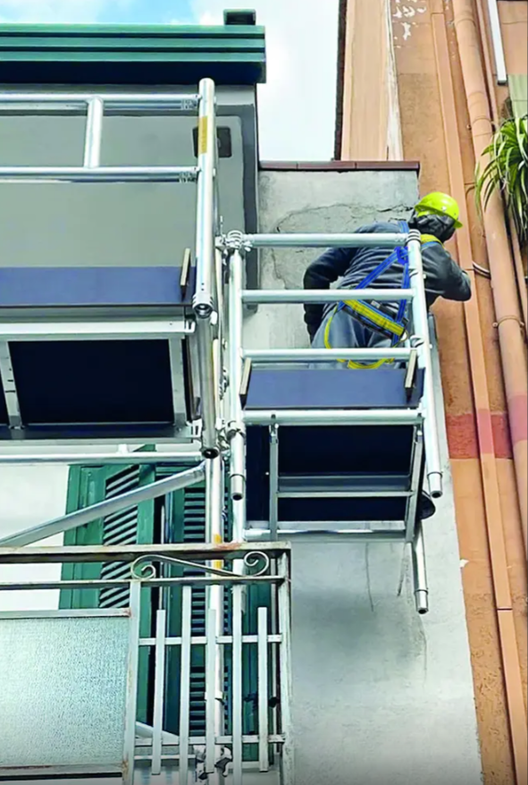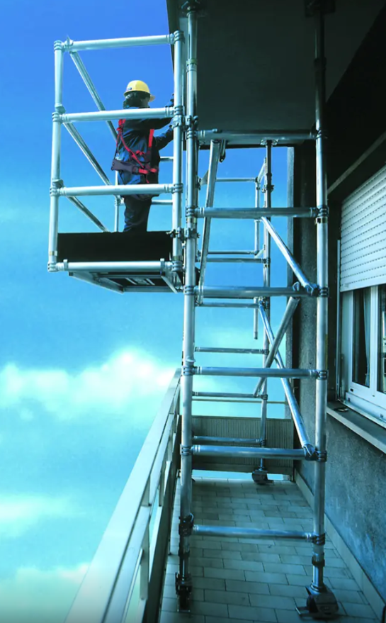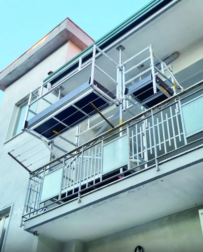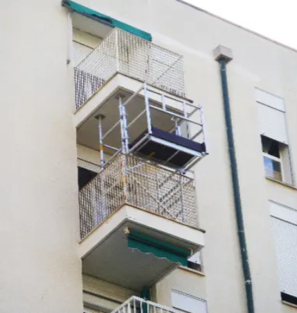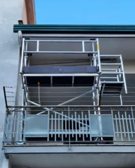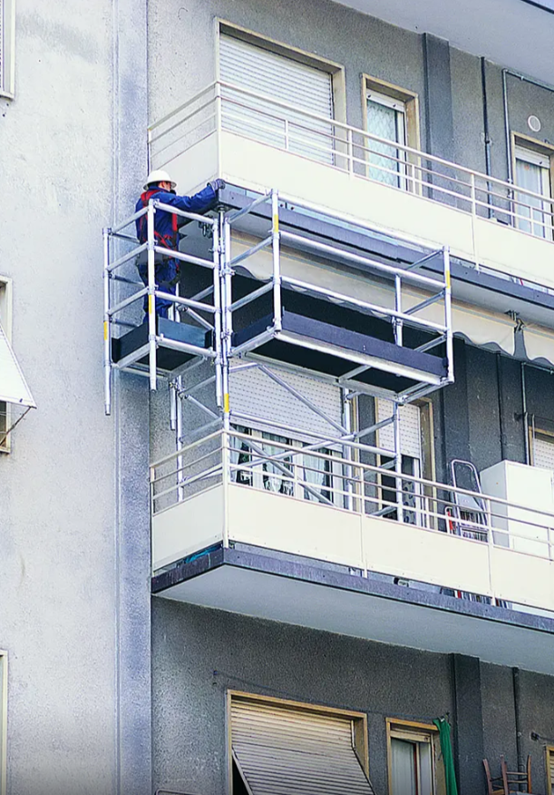Schela din aluminiu de ø 50 mm cu rezistenta mecanica foarte mare, special realizata pentru intretinerea balcoanelor. Un produs foarte usor, rapid de asamblat, care poate fi transferat cu usurinta de la un balcon la altul. Este foarte convenabila pentru aplicații ocazionale, pentru a înlocui platformele aeriene cu roți și schelele de fațadă fixă.
